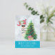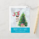 Christmas greeting postcard with a funny illustration. A cute llama wearing black sunglasses and a red santa hat. Standing behind a Christmas tree with festive presents. The word Joy written above his head in a colourful holiday font. Silver bokeh background with an icy blue border. Whimsical and fun Christmas themed design.