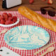 A stylish and sophisticated paper plate with an elegant faux marble pattern with swirling colours in turquoise blue and cream colours.