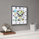 A clock with a cute and colourful pattern with all kinds of outer space themed elements. Images include astronauts floating around in their white space suits. Stars and planets and cool little rocket ships, spaceships, and satellites. Fun and crazy design.