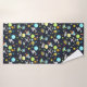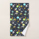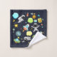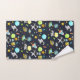 Towels with a cute and colourful pattern with all kinds of outer space themed elements. Images include astronauts floating around in their white space suits. Stars and planets and cool little rocket ships, spaceships, and satellites. Fun and crazy design.