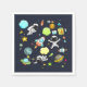 Paper napkins with a cute and colourful pattern with all kinds of outer space themed elements. Images include astronauts floating around in their white space suits. Stars and planets and cool little rocket ships, spaceships, and satellites. Fun and crazy design. Dark background.