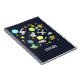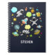 Personalised notebook with a cute and colourful pattern with all kinds of outer space themed elements. Images include astronauts floating around in their white space suits. Stars and planets and cool little rocket ships, spaceships, and satellites. Fun and crazy design.