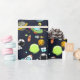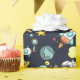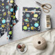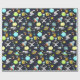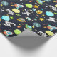 Patterned wrapping paper with a cute and colourful pattern with all kinds of outer space themed elements. Images include astronauts floating around in their white space suits. Stars and planets and cool little rocket ships, spaceships, and satellites. Fun and crazy design.
