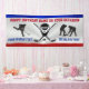 Cool PERSONALIZED Hockey Birthday Banner with 3 Text Boxes to type in Hocket Team Banner or ANY Special OCCASIONS and Hockey Player's NAME or TEAM Name and Your Text or Delete it. Red, Grey and Blue Colours accent the Black Hockey Players silhouettes, hockey mask and hockey sticks. I can place this hockey banner design on ANY of our hundreds of hockey party supplies and gifts or change the Banner size, outdoor or indoor, with or without grommets.