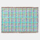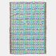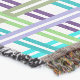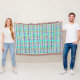 This throw blanket has an Art Deco design of a plaid made of two shades of turquoise, two shades of purple, and two shades of green.