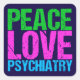 Peace Love Psychiatry in bright, bold neon letters of green, pink, and blue. I love the field of psychology and medicine getting combined into my speciality, psychiatry. Personalise with your psychiatrist's information as a gift.