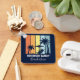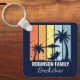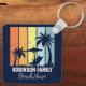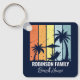 Personalised navy blue beach house keychain for your family home in Hawaii, Florida, or other tropical island destinations. Cool palm trees sway against retro colours of orange and yellow above your customised vacation name in white script. Great for a group going on a cruise or coastal getaway.