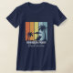 Personalised navy blue beach t-shirts for your family trip to Hawaii, Florida, or other tropical island destinations. Cool palm trees sway against retro colours of orange and yellow above your customised vacation name in white script. Matching tees are great for a group going on a cruise or coastal getaway.