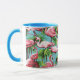 Nostalgic and cool design in bright graphic colours featuring pink flamingoes and green palm trees against a deep sky blue background.