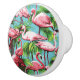 Nostalgic and cool design in bright graphic colours featuring pink flamingos and green palm trees against a deep sky blue background.