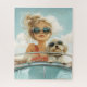 A stylish young girl and her fluffy dog enjoy a sunny road trip, both wearing sunglasses, exuding confidence and joy.