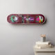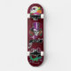 The cool skateboard deck has a trio of tattoo style skulls on a red to burgundy background. At the top there is a fun Candy Skull with four roses in pop colours. In the centre there is a wicked skull wearing a purple tophat. There are two roses on either side with a raven just below. Below that is a banner that reads, "Let it Roll." The third skull has blue accents, fangs, and three roses.