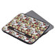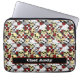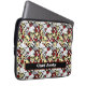 Cool laptop case printed with a hand drawn pattern of skeleton skulls wearing white chef hats, surrounded by red roses, playing cards and kitchen knives