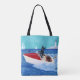 Cool Summer Labradors Painting Tote Bag. Whimsical and funny Labrador Summer Painting painted by Naomi Ochiai. Super Cool Labrador Retriever dogs are having fun with their motor boat in the sea. Yellow Labrador driver is as cool as ice!! Black Labrador is posing like a star!! And Chocolate Labrador is holding on for dear life. Nice for dog lovers who love Labradors. Beautiful Summer View with Labradors and Sea and a boat and a light house.