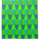 This shower curtain has a Bauhaus design of repeating trapezoids in shades of blue and green.