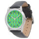 This men's watch has a Bauhaus design of repeating trapezoids in shades of blue and green.