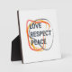 Cool, unique, trendy, urban design of a saying "love, respect, peace" in orange, yellow, grey colours. Curvy, organic shaped brush strokes are used. Modern, trendy, simple vector art, graphic design artwork.