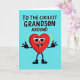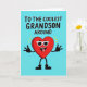 This greeting card features a teal background with a big, red heart character in the middle wearing white sunglasses. The heart has a silly, friendly expression with its tongue sticking out, and its short black arms and legs are spread wide like it’s showing off. Little yellow lines above the heart add a sunny, excited look to the scene. Across the top, the text reads “TO THE COOLEST GRANDSON AROUND” in rounded black letters that look simple and easy to read. The message sits high on the card, leaving the heart character to take center stage underneath it. It feels like a fun way to tell your grandson you adore him and enjoy his personality, with just the right touch of humor 🥰. It’s the kind of card that can make someone smile right away and feel loved ❤️