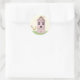 The sticker is made on wonderful paper and had no problem sticking to the bag that I purchased to put it on. I wanted to find a design that would be cute for the bride and groom and this one fit the bill as it has cute "bees" buzzing around and the wedding was taking place in a town called "Bee Cave". The packaging was great and protected the stickers. The website is easy to navigate and there are so many color choices. I had no problem finding a color that the bride was using on everything else selected. The design was adorable and there were many to choose from. You can make the figure as larger or smaller and you can place the photo and writting whereever you want to in the sticker. The printing is fabulous..better than expected.