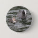 This button features a photograph of a Coot and her chick swimming on a tidal river. The female is grey with a white patch on her head and red eyes, while the tiny fluffy chick is pale grey with a white front.