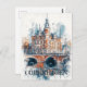 This postcard offers a lovely watercolor-style illustration representing the beautiful canals and unique architecture of Copenhagen, Denmark. It is a great postcard for travelers to the capital city of Denmark: Copenhagen.