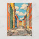 A vibrant and colourful illustration of a charming cobblestone street in Copenhagen, Denmark. The buildings are painted in a variety of pastel hues, creating a cheerful and inviting atmosphere. A couple rides a bicycle down the street, while fluffy clouds drift across the blue sky. The overall scene is peaceful and idyllic, capturing the essence of this beautiful European city.