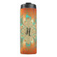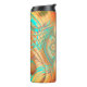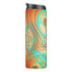 This unique thermal tumbler displays an abstract pattern of rich, warm colours of copper and bronze. Aqua accents give it a pop of brighter colour too.