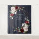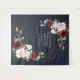 Modern and trendy, this gorgeous wedding tapestry design features a faux copper rose gold geometric embellished with beautiful burgundy and pink watercolor roses, buds, and eucalyptus greenery, on a modern navy blue background. Copyright Elegant Invites, all rights reserved.