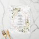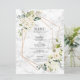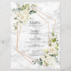 Modern and trendy, this wedding menu features a faux copper geometric embellished with watercolor white floral and eucalyptus greenery floral arrangements, over a faux white marble texture. Copyright Elegant Invites. All rights reserved.