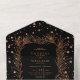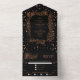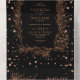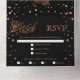 Copper glitter pine frame with cone confetti black winter Christmas wedding All in One Invitation. A lovely wedding design that includes a copper pine frame with cone and needles and confetti on black background. The tear-off RSVP card is detachable.