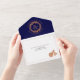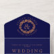 Copper glitter rose wreath on navy blue wedding all in one invitation