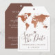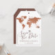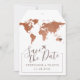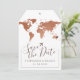 A luggage tag shaped destination wedding save the date with a faux copper foil world map with an editable heart location marker and romantic aeroplane icon. Select your own background colour on the back side of the tag card to coordinate with your travel theme wedding colours.