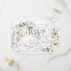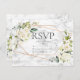 Modern and trendy, this wedding invitation RSVP design features a faux copper geometric embellished with watercolor white floral and eucalyptus greenery floral arrangements, over a faux white marble texture. This is the no meals option. Part of a matching wedding set. Copyright Elegant Invites. All rights reserved.