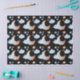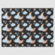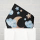 Fun digital patter features copper coloured moons and stars with fluffy blue clouds on black background.