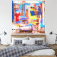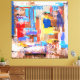 Bold strokes of vibrant blues, reds, and yellows mix with earthy tones to create a dynamic and energetic composition. The abstract patterns and splashes bring a sense of movement and spontaneity to the piece.