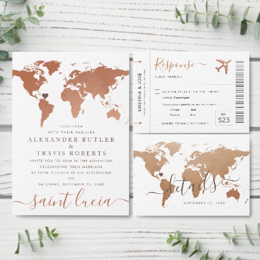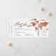 Boarding Pass Save the Date Cards feature an elegant modern map design with a faux copper foil travel theme design. All text and background colours are editable, so you can create your own design using this template for a plane ticket which was designed with a destination wedding or travel theme wedding or vow renewal celebration in mind. Visit the Custom Paper Works designer collection for matching items.