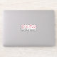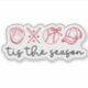 This sticker features a baseball and softball themed design in a red, hand-drawn style. It includes a glove, crossed baseball bats with small heart shapes around them, a baseball with a bow tied around it, and a baseball cap with the text "tis the season". The design is simple yet stylish and trendy.