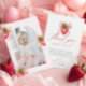 The Coquette Berry First Birthday Photo thank you card captures the sweetness and joy of celebrating your little girl’s first year, blending playful charm with timeless elegance. At the heart of this design is a delightful strawberry motif, symbolising the fresh, vibrant beginnings of childhood. The rich red of the strawberries is perfectly balanced by soft pink hues, creating a tender and joyful palette that sets the tone for a berry first birthday celebration.