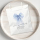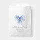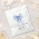 Elegant favour bags for your bridal shower featuring a large blue coquette bow watercolor, "with love and thanks" in a chic script, and the bride's name and shower date in simple modern lettering.