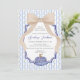 This elegant bridal shower invitation brings together timeless charm and modern grandmillennial style. At the centre, a beautifully intricate blue chinoiserie pumpkin sits atop a crisp white background, framed by a double border of classic scalloped and chinoiserie-style edging in soft navy blue. The backdrop features vertical blue and beige stripes filled with alternating light blue chinoiserie pumpkins and golden-brown stems, adding a structured yet whimsical pattern that feels both traditional and fresh.