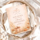 A warm and cozy fall baby shower design featuring a hand-painted watercolor pumpkin surrounded by soft peach florals, golden leaves, and delicate autumn accents. The earthy orange palette and elegant arch layout create a refined harvest aesthetic that feels timeless and inviting. Perfect for an autumn celebration, a neutral fall theme, or a charming “Little Pumpkin” baby shower with rustic floral details.