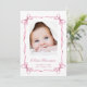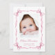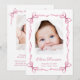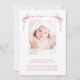 A sweet card to announce the birth of your baby girl featuring her photo in a watercolor frame composed of pink delicate ribbons and coquette bows, blending a minimal aesthetic with a touch of whimsical vintage charm. Her name is showcased in an elegant pink script and her birthday and birth stats are in classic serif typography. On the back, add an additional photo and your personalised message to family and friends.