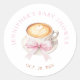 Celebrate the upcoming arrival with these charming coquette coffee baby shower stickers. Featuring a delightful watercolor illustration of a cappuccino adorned with a delicate pink bow, these stickers are perfect for adding a sweet touch to your invitations, favors, or gifts. The soft pastel color palette and elegant design evoke a sense of warmth and anticipation, making them an ideal choice for any chic baby shower celebration. Personalize with your chosen name and date to make them uniquely yours and a cherished keepsake for your special day.