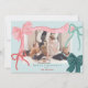 Celebrate the season in style with this charming, coquette-inspired Christmas photo card, featuring hand-drawn bows, soft colours, and a romantic, ribbon-filled design. The front features your favourite picture framed by four hand-drawn bows—one bold pink ribbon with red stripes, one green ribbon with navy stripes, plus two smaller accents in classic red and green. The back offers a soft alpine pine green background with a delicate bow pattern.