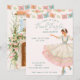 This bachelorette party invitation has a folk dancer with a pink, white a blue dress with papel picado banners on top. All the important party details can be personalized. The back has a coordinating Mexican pueblo scene. Colors include blue, yellow, pink, white and coral.
