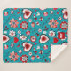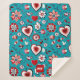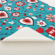 This blanket design features a charming and vibrant pattern with a teal background adorned with an array of floral motifs and heart accents in red, white, and pink. The bold flowers and whimsical hearts create a playful, romantic aesthetic. A monogram section in the bottom corner is customisable with your chosen initials, adding a personal touch to this cosy and stylish piece. Perfect as a gift or a statement decor item!
