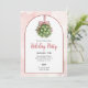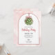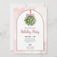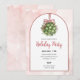 These Christmas party invites feature a watercolor portrait of a ball of mistletoe hanging up by a red and white stripped ribbon bow.