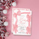 Celebrate your little one on the way with this charming, coquette-inspired girl's baby shower invitation, featuring hand-drawn bows, soft colours, and a romantic, ribbon-filled design. The front features a wreath of hand-drawn bows—bold pink ribbon with red stripes. The back offers a light pink background with a delicate bow pattern.