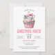 Coquette Christmas party invitation with a pink cupcake illustration and a bow, stocking, and candy cane. Personalise it with your party details and RSVP information.