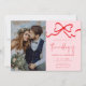 The wedding invitation design showcases a bold red ribbon bow atop a soft pink background. Combined with elegant fonts and funky script, it exudes a modern yet chic and charming vibe sure to captivate recipients. This unique style sets the tone for an exciting celebration ahead, delighting guests upon receiving the card.